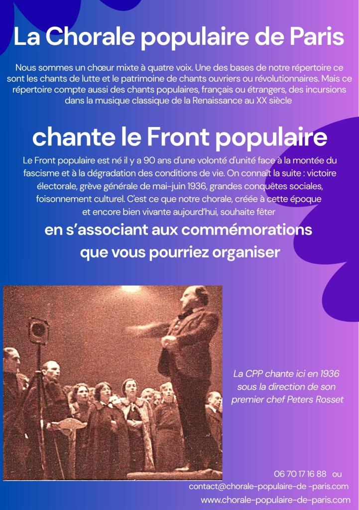 La Chorale populaire de Paris fêtera sa création en 1935, ses fondateurs, ses concerts dans la période foisonnante du Front populaire. Cette célébration du 90ème anniversaire commencera le 16 mai, avec le CONCERT POPULAIRE, dans lequel on retrouve La Varsovienne, un chant révolutionnaire polonais harmonisé par Peters Rosset, notre premier chef de chœur disparu pendant la seconde guerre mondiale. Elle se poursuivra avec une grande manifestation organisée le 5 décembre dans le patio du siège de la CGT à Montreuil.